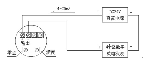 2.校驗(yàn):以二線制0-8%硫酸濃度變送器為例,按圖四接線。